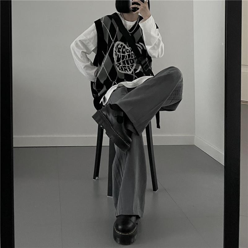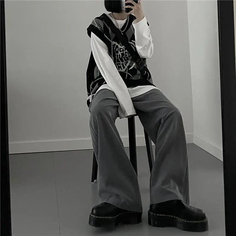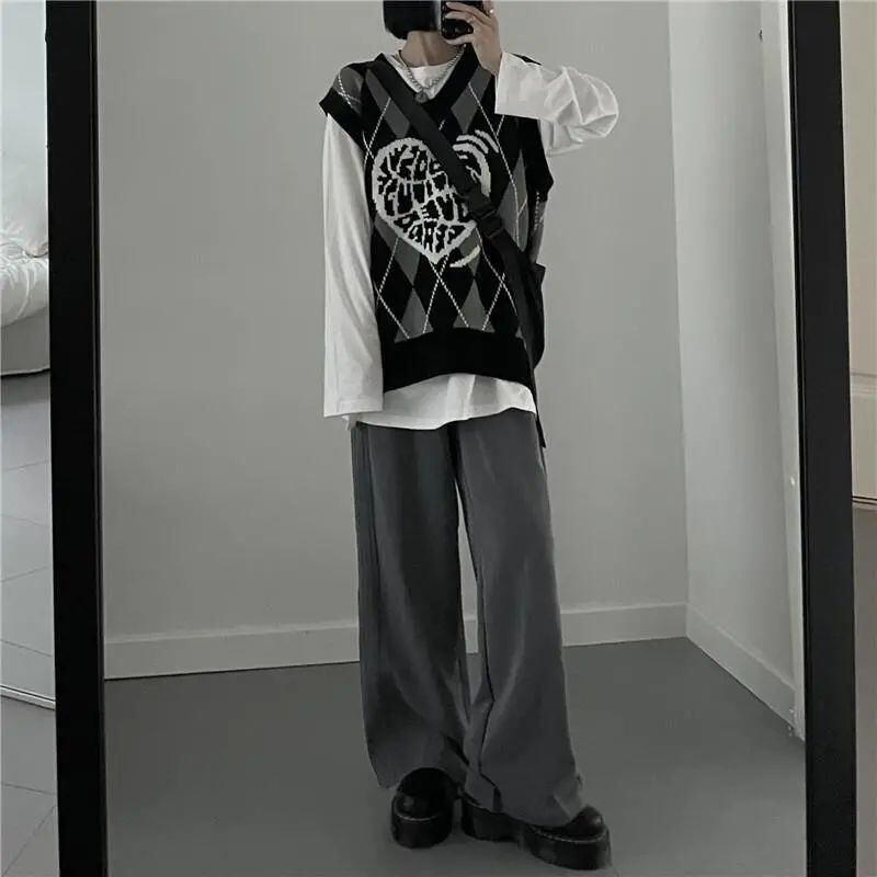 ゴシックストリート黒チェック柄ニットベスト原宿特大セーターノースリーブ V ネックルーズグラフィックトップスパンク Y2K ベスト ブラック かわいい Vネック