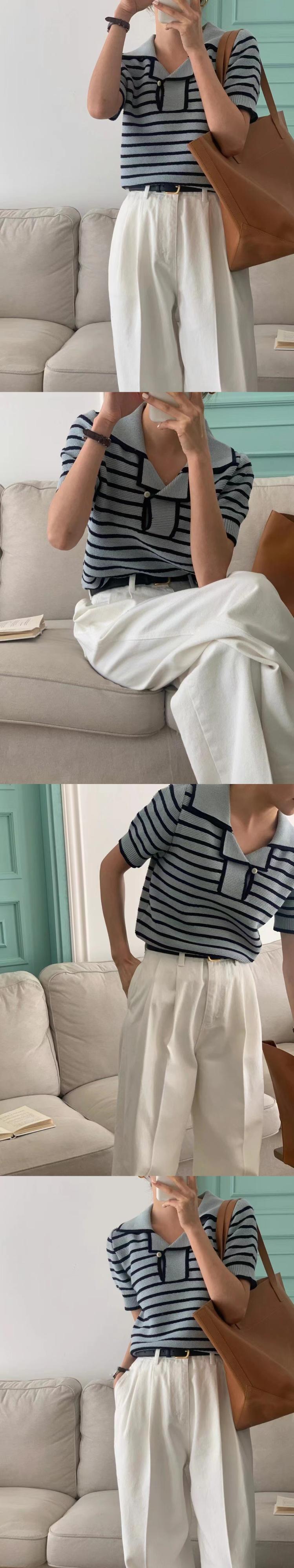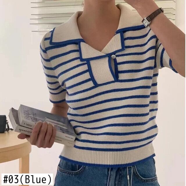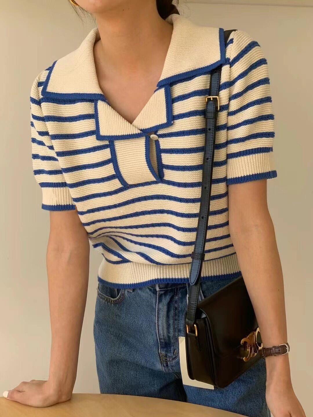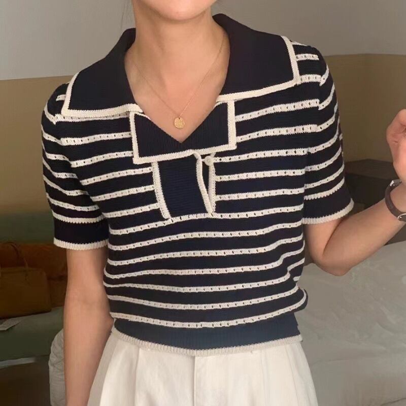 ラペルレトロ半袖ストライプセーターアイスニットトップスプルオーバーセーター Y2k プルジャンパーシャツ ショート ハーフスリーブ シルク