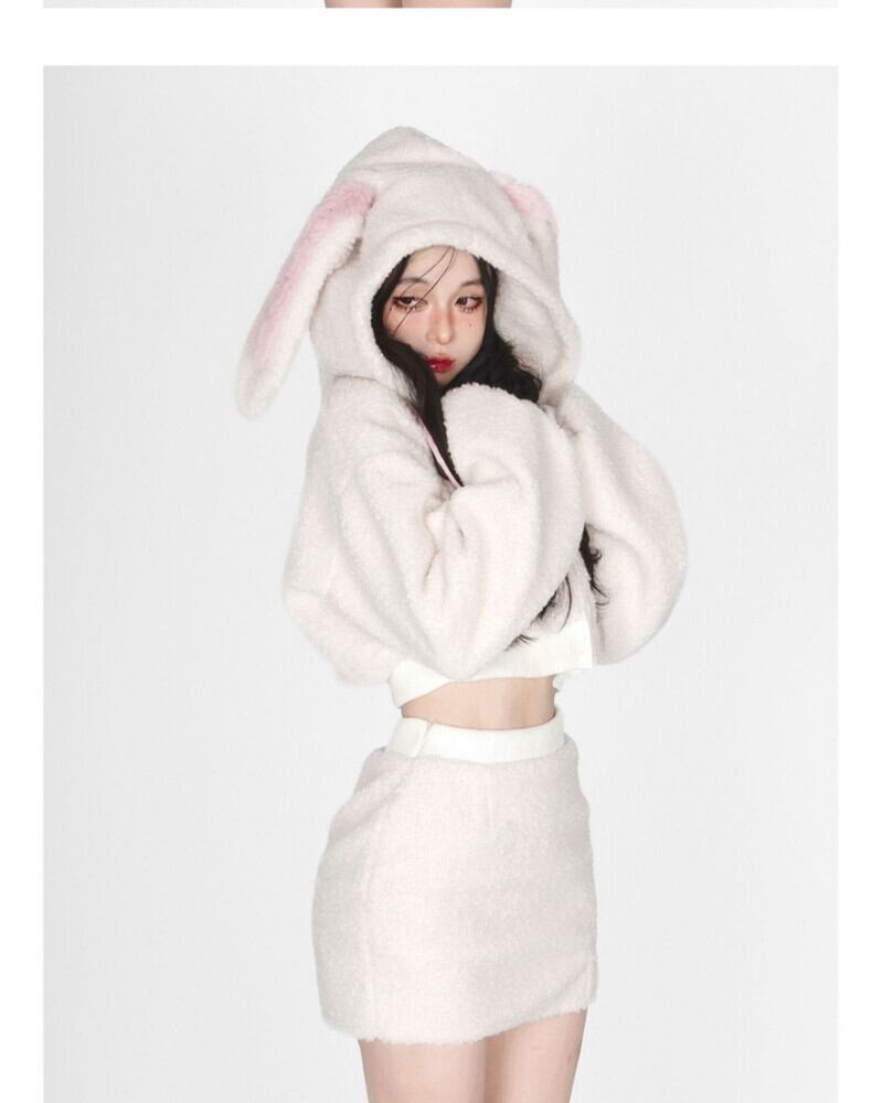 ウサギ耳パーカー毛皮フード付きスウェットホワイトトップ春秋ジャケットレディース 2 ピースセットクロップショートスカート ese Y2k シャツ スプリング 春物 オータム 秋物