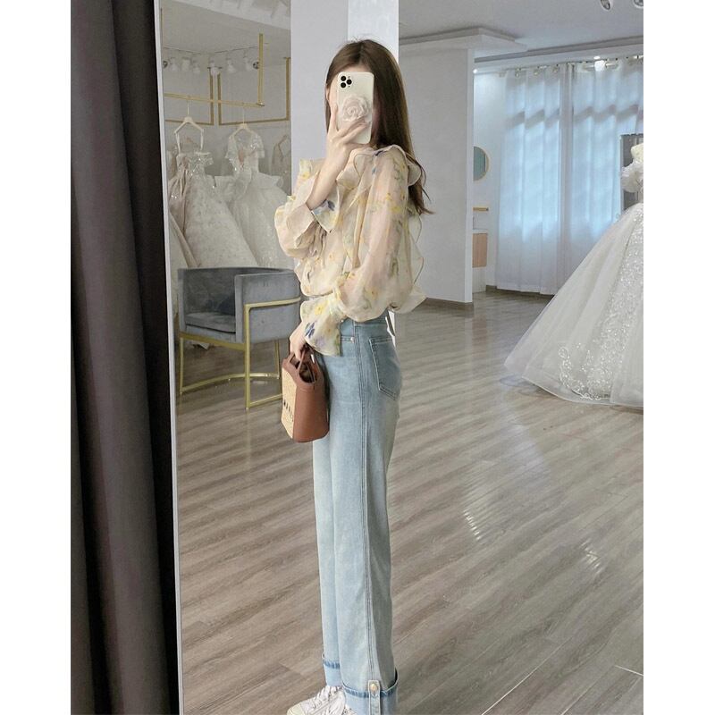 カミーサ長袖シフォンシャツ日焼け止め花柄シャツレースアップブラウスデモーダ春スリムフレアトップ ロング スプリング 春物