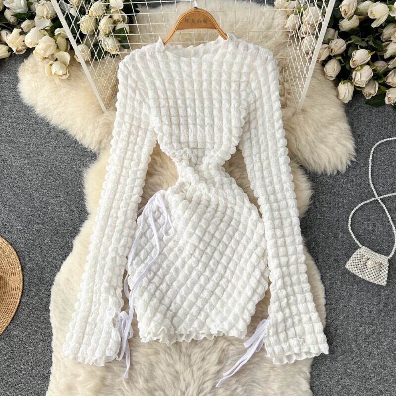 Vestidos エス パラ ボディコン ミニ スリム レースアップ ラップ ヒップ ショート 長袖 3D チェック柄ドレス ピンク ホワイト Y2k ワイルド ロング