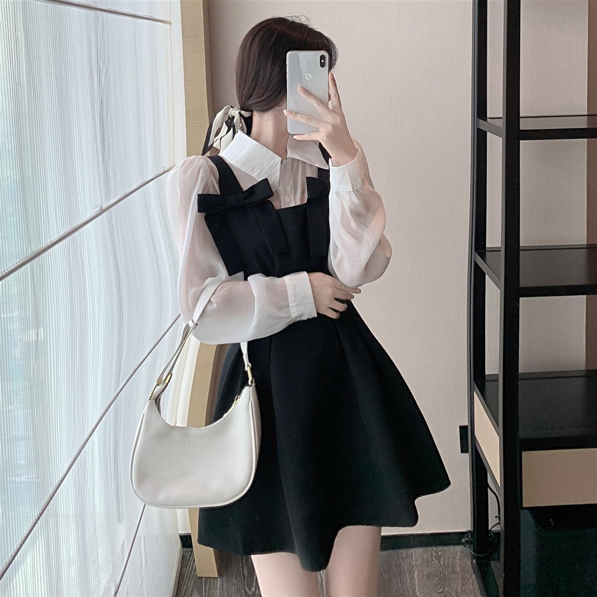 弓中断ドレスミニ Vestidos ルーズ白シャツ 2 ピースセット衣装オフィスレディ黒ドレス春秋シックトップ ホワイト ブラック スプリング 春物 オータム 秋物 会社 学校 通勤や通学にも