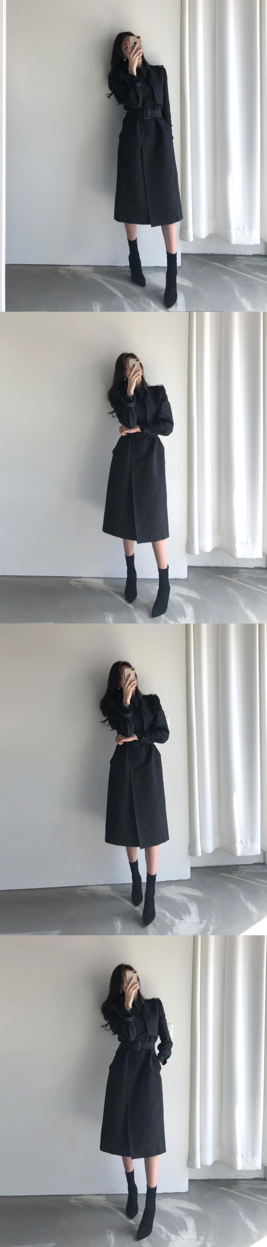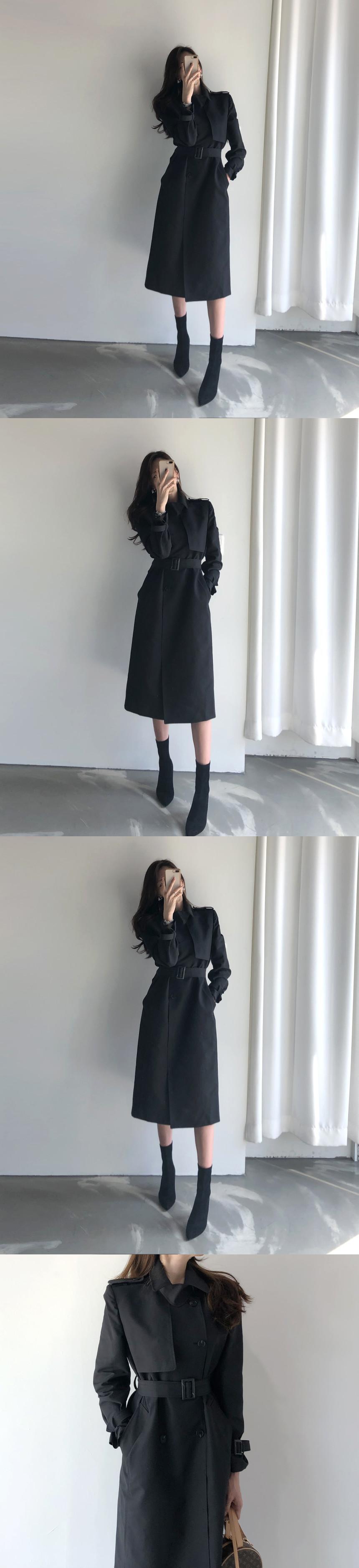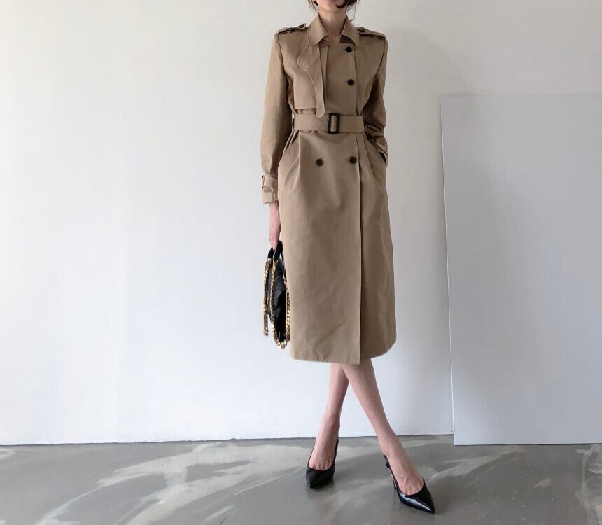 ベルトウエストラペルダブルブレストトレンチコートストレート秋コートカーキロング黒ジャケット Roupas s ブラック オータム 秋物 ハーネス