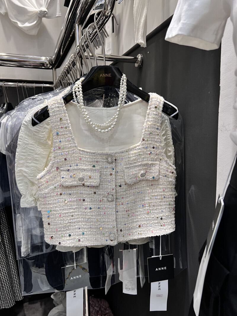 スリムボタンシャツスタイルクロップトップスクエアカラースパンコールジャケットノースリーブツイードベスト Chaquetas 服 Y2k コート スクウェア