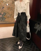 フリルシャツ秋ルーズ長袖ブラウスルーズトップデブラックジャカードスカート ロング オータム 秋物