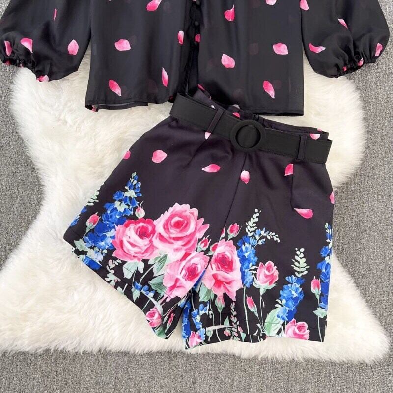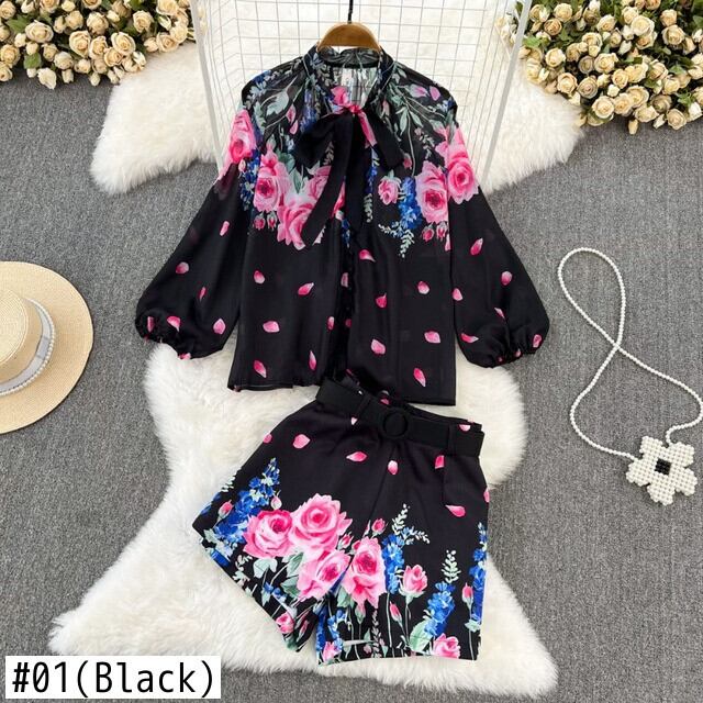 気質蝶ネクタイルーズプリントシャツツーピースセットウエストワイドレッグショーツアップブルーサ花柄シフォンシャツ秋トップス リボン オータム 秋物 ブルマー ワイドパンツ