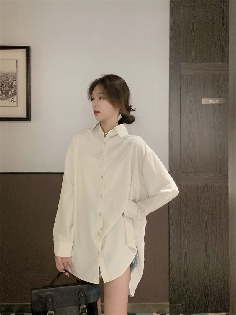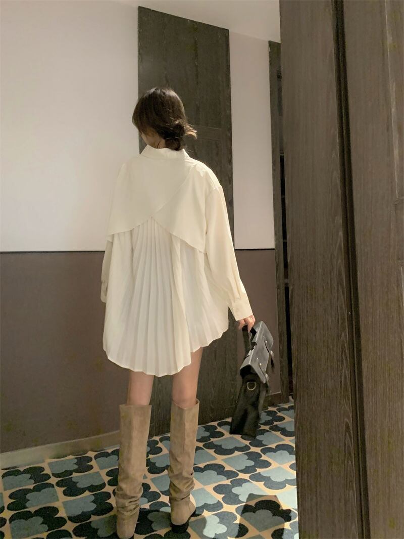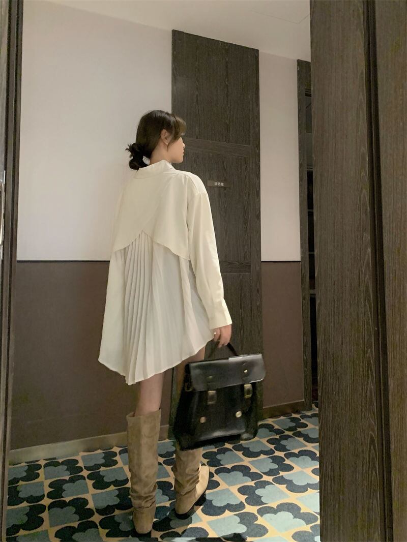 プリーツシャツ春オールマッチルーズスタイル長袖トップ ロング スプリング 春物 ソリッドカラー