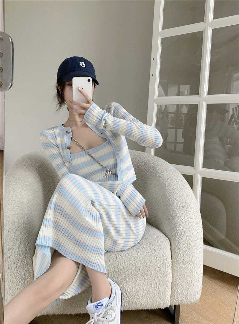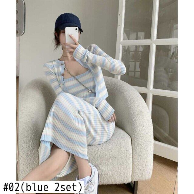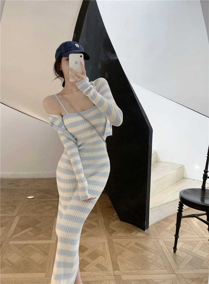 中断ドレス春秋スリムクロップカーディガンボディコンニットストライプドレス 2 セット黒 Vestidos トップ ブラック スプリング 春物 オータム 秋物 2セット