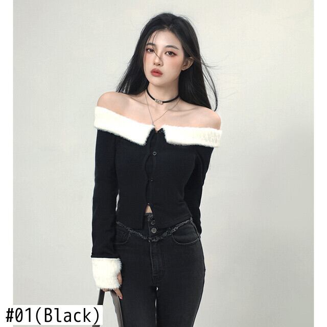 シャツスパイシーガールセクシーオフショルダーニットトップジャージ毛皮襟セータースリムプルピンクセーター Y2k 黒 ブラック