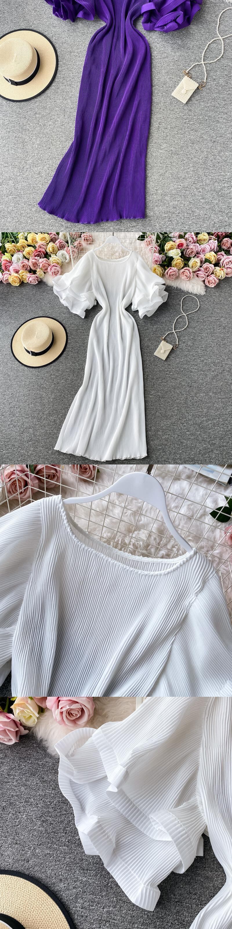 ラウンドネック フレア 半袖 プリーツ ロングドレス ウエスト フリル ベスト シフォン ショート ハーフスリーブ ラッフル Oネック
