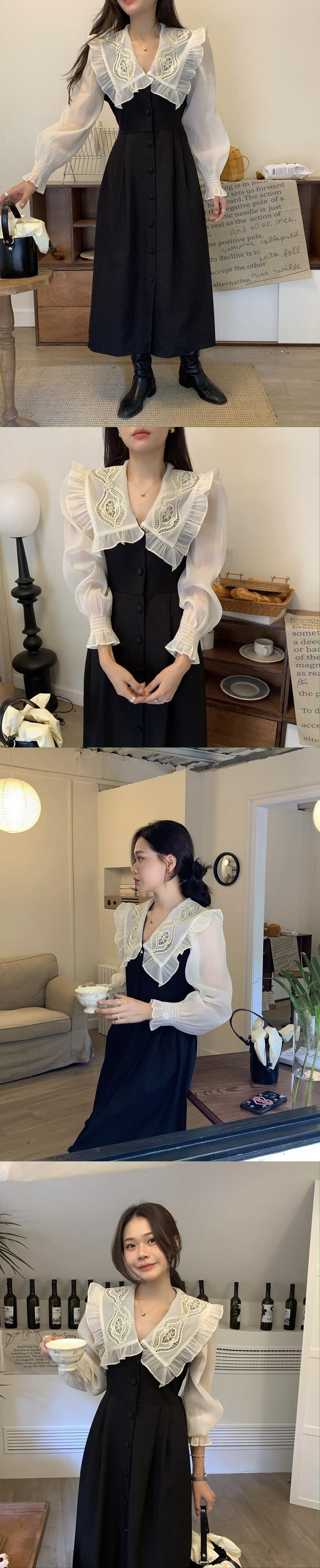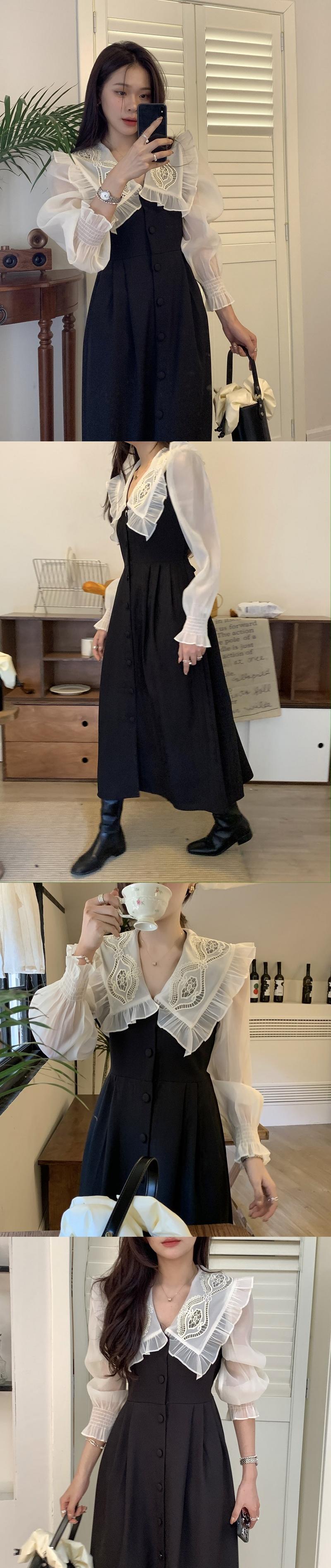 ウエストラペル刺繍レースコントラストステッチフェイクツーピースブラックドレス Vestidos デパーティー レッド