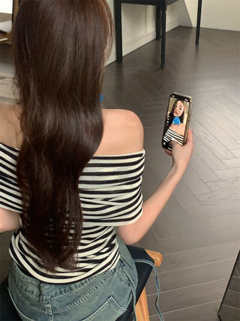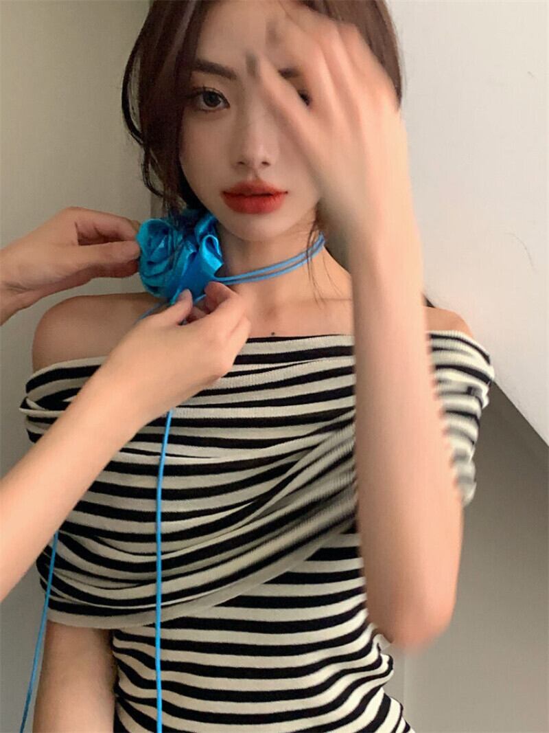 シャツストライプオフショルダー半袖 Tシャツ春夏 Tシャツボトムニットトップススリムグラフィック Tシャツ ショート ハーフスリーブ スプリング 春物 サマー 夏物