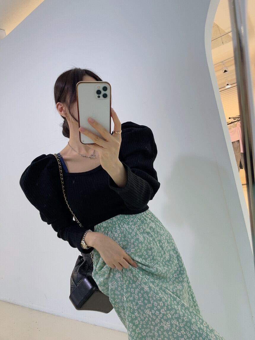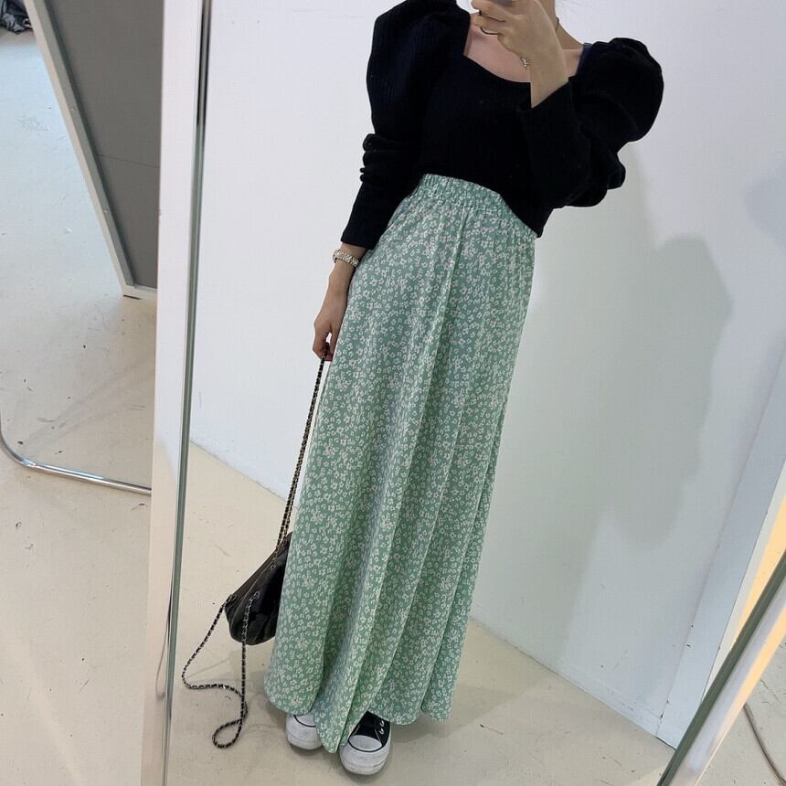 グリーン花柄ハーフスカートウエストプリーツフィッシュテールスカート Faldas Largas ミディロングスリムペチコート春 スプリング 春物