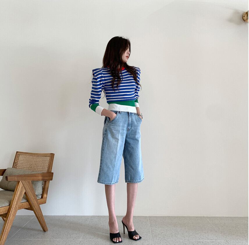 秋プルストライプ甘いパフスリーブショートセータースリムシック冬プルオーバーセーター Y2k 大人ガーリー スウィート キュート カジュアル オータム 秋物 ウィンター 冬物