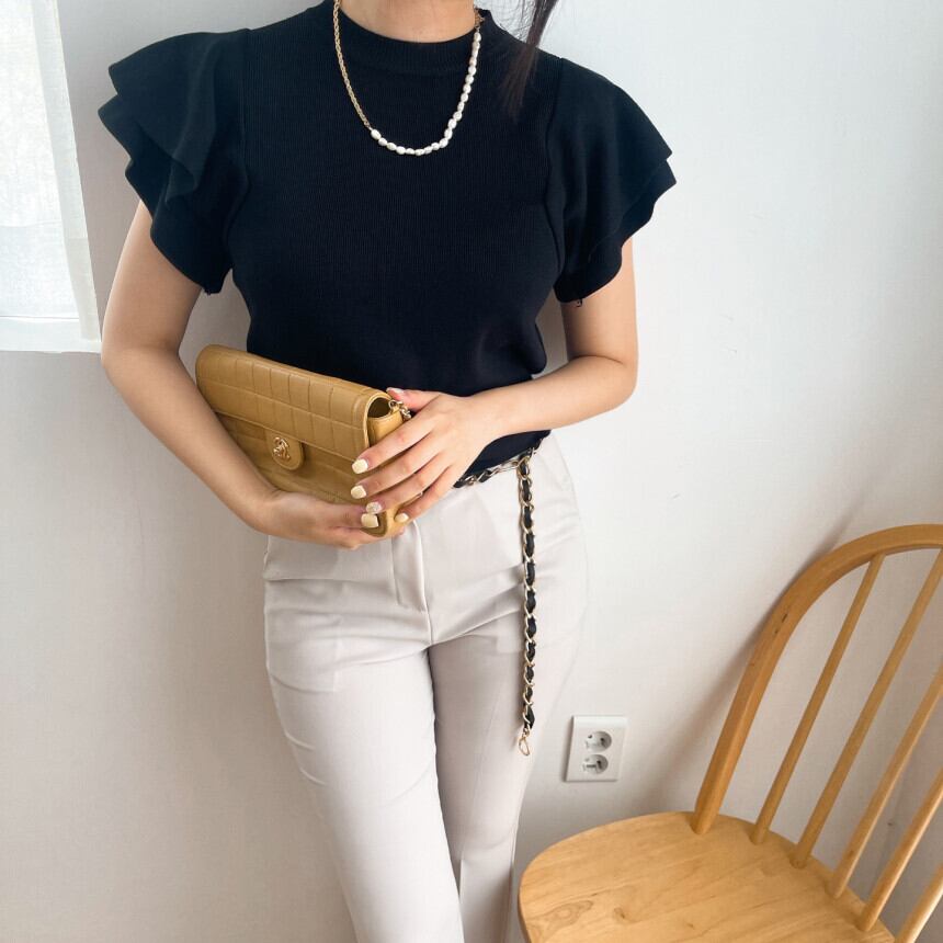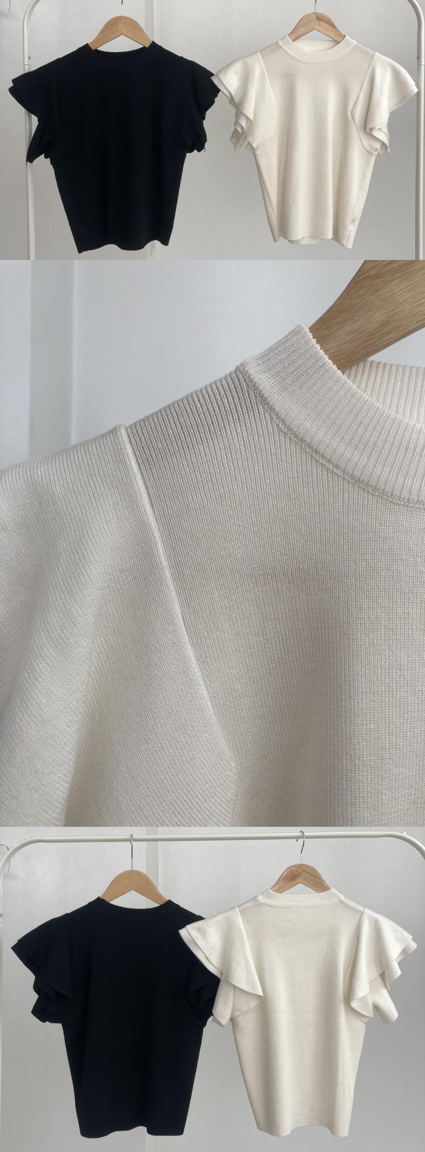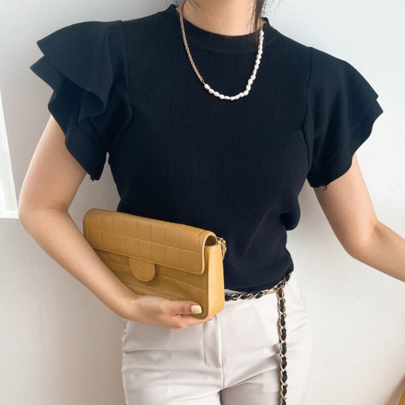 夏秋ニットトップスショートフリルフライングスリーブセーターシックジャンパープルオーバー生き抜くトップス サマー 夏物 オータム 秋物