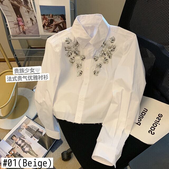 春白トップスフレンチヘビーワークビーズ優しいブラウスネック長袖通勤ルーズシャツ ロング ホワイト スプリング 春物