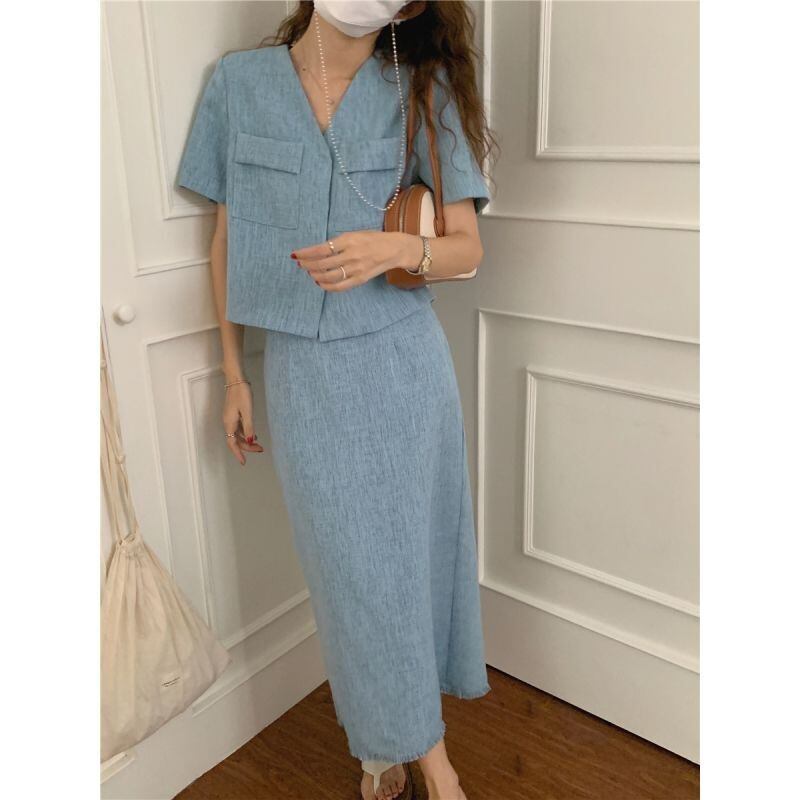 スカートセット V ネックブレザー半袖カーディガン 2 点セットレディース衣装ペンシルデニムスカートジーンズジャケット Y2k トップコート ショート ハーフスリーブ Vネック