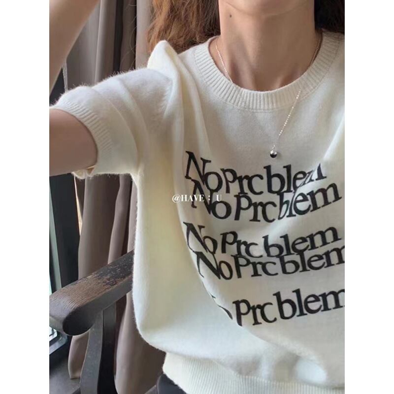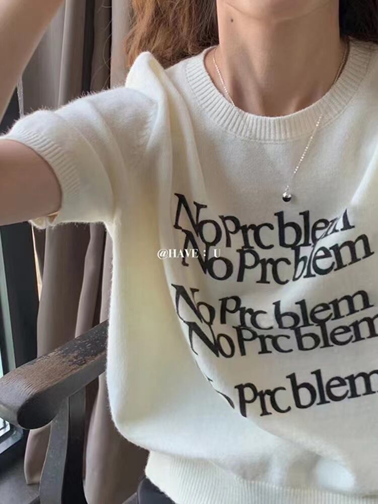 レタープリントニットトップススリム半袖 Tシャツルーズ O ネック Y2k 美的クロップドトップセーター ショート ハーフスリーブ Oネック