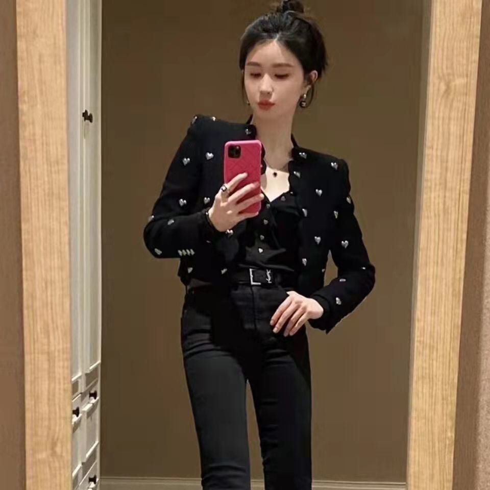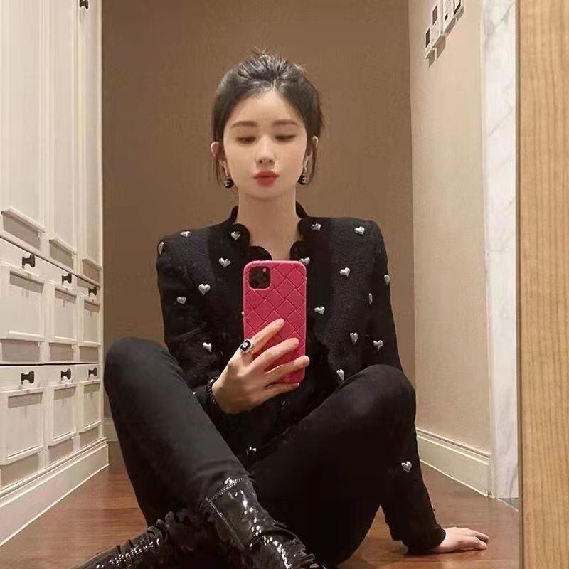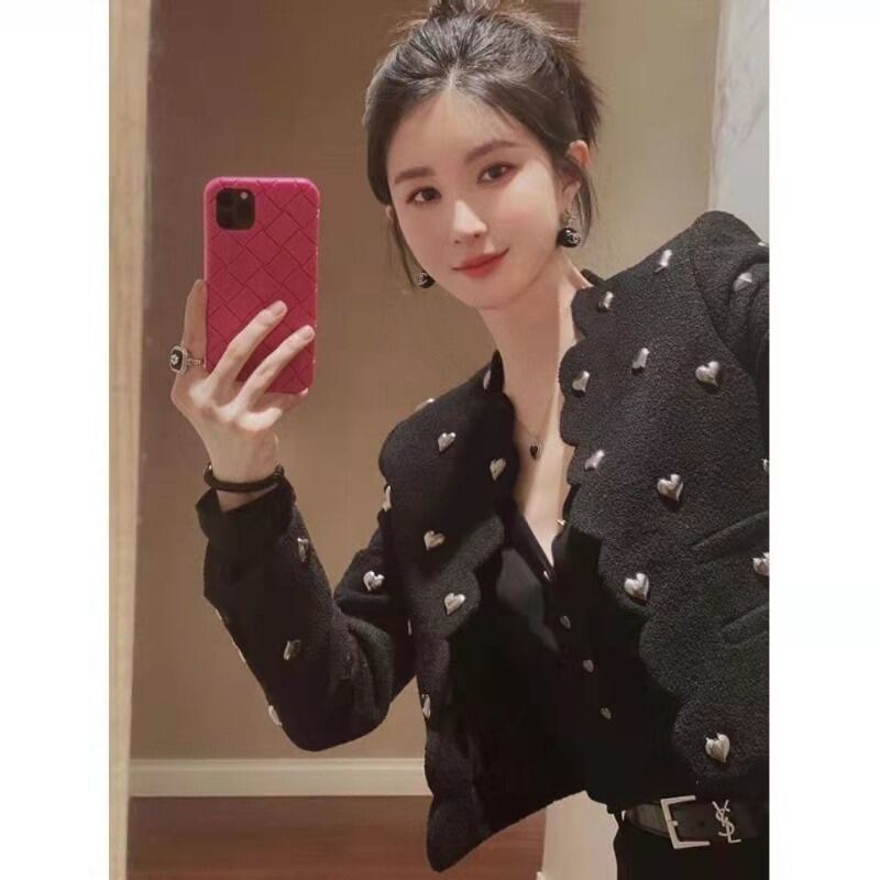 ツイードジャケット O ネック長袖ウールコート秋冬生き抜く Y2k ブラック ロング オータム 秋物 ウィンター 冬物 Oネック