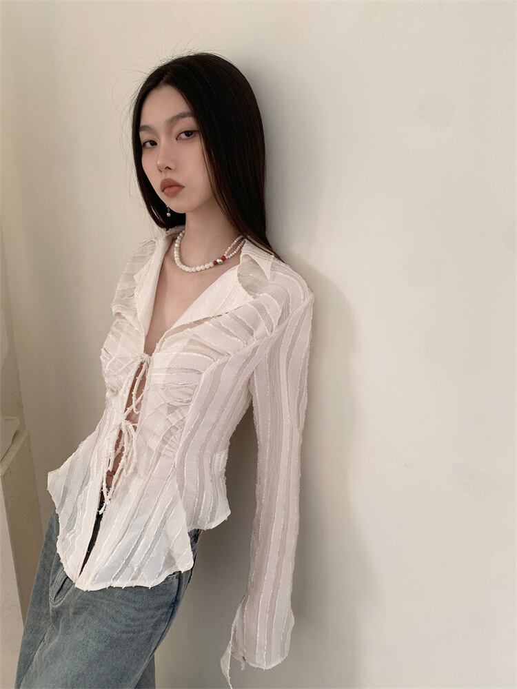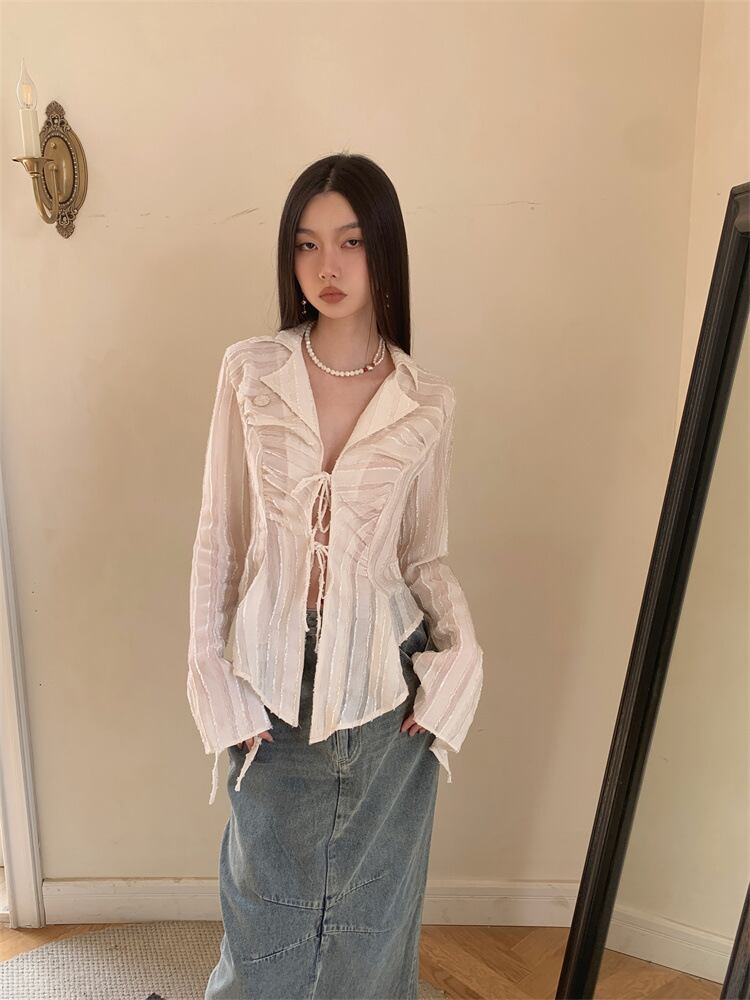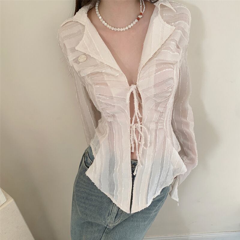 シック Fairycore レースアップブラウス長袖春ターンダウンカラーシャツトップスシャツ ロング スプリング 春物