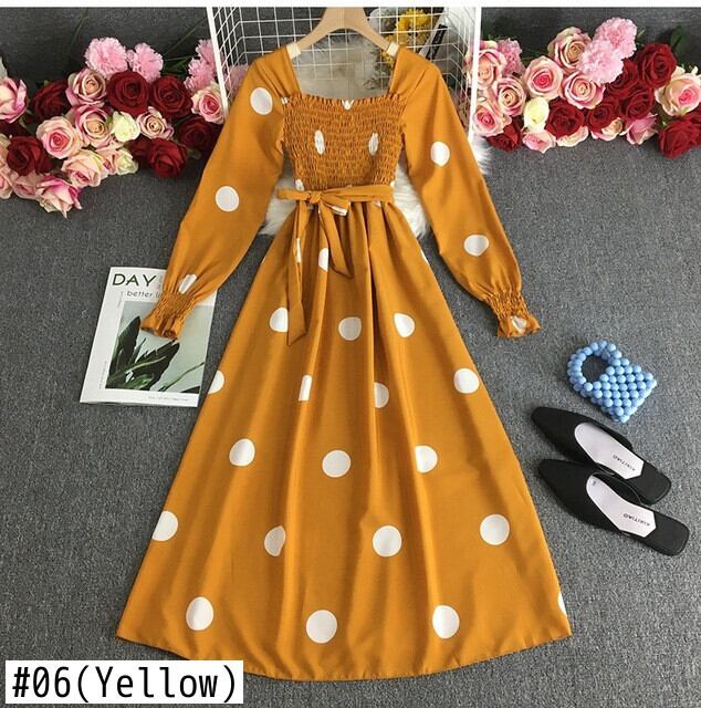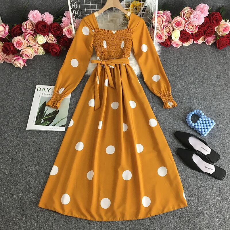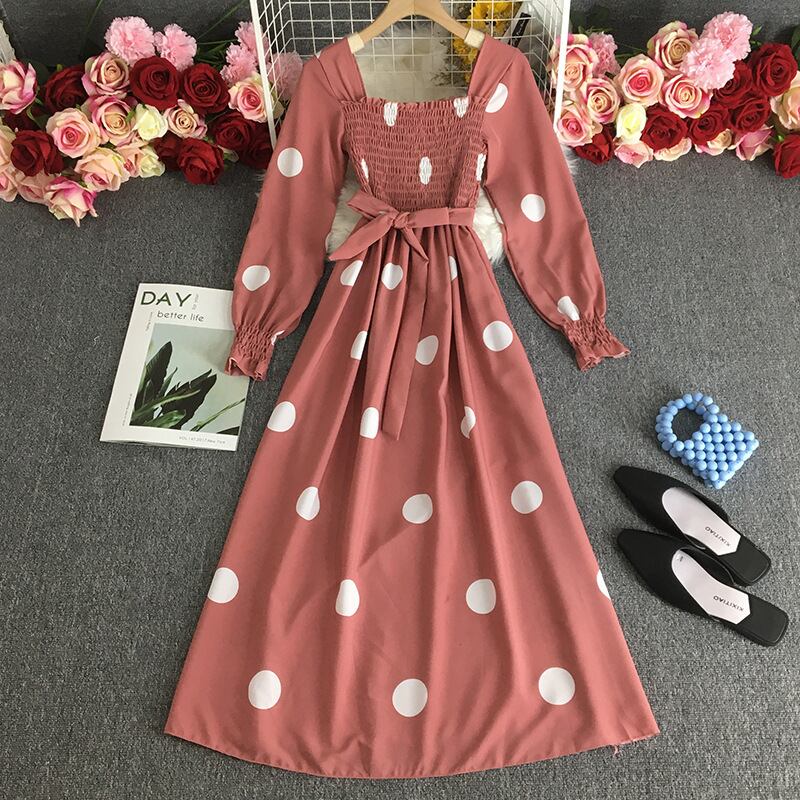 レッドレースアップウエスト甘いスクエアカラープリントポルカドットドレス Vestidos es パラプリーツルーズ春 大人ガーリー スウィート キュート カジュアル スプリング 春物 スクウェア