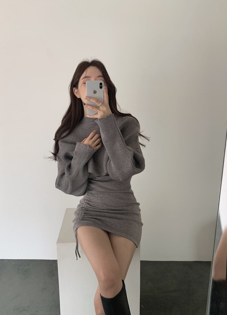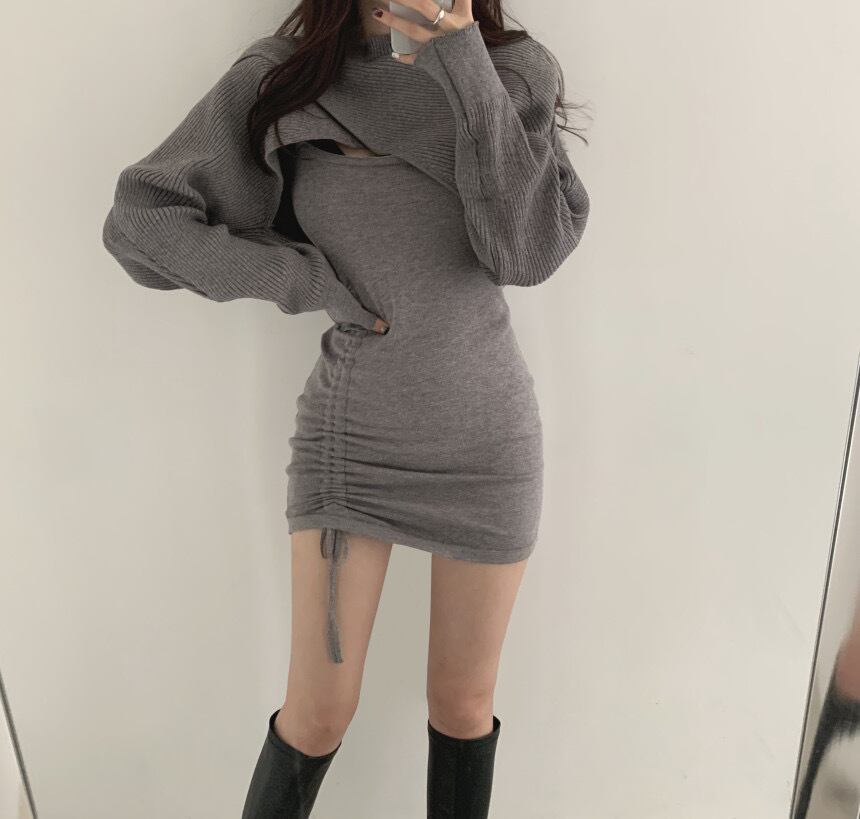 調節可能プルオーバー不規則ヒップラップ巾着グレーセータードレスミニベスト襟ボディコンニット アジャスタブル