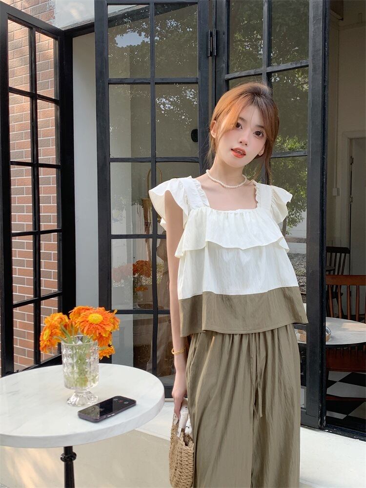 パンツセット タンクトップ 背中開いたキャミソール スクエアフライスリーブ フリルルーズシャツ トラックスーツ パンツ 2点セット Y2k ブラウス スクウェア