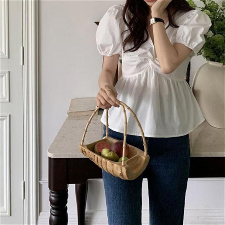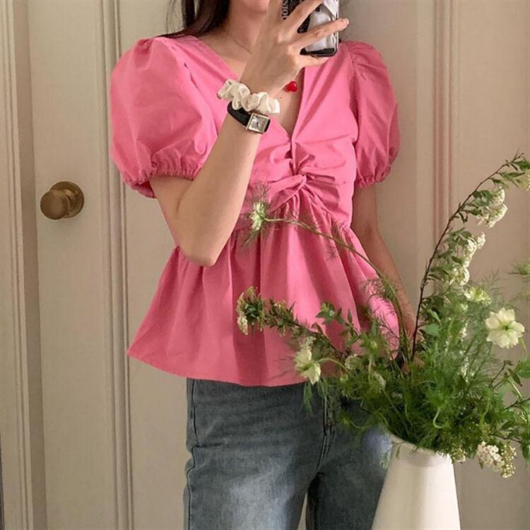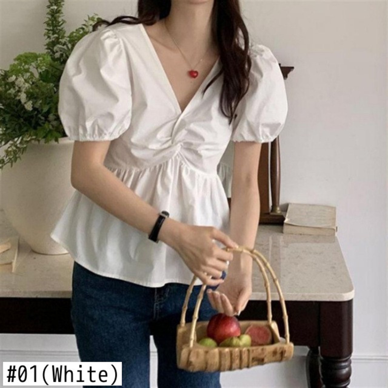 シャツ V ネックパフ半袖セクシーブラウス白シャツプリーツクロップトップ ショート ホワイト ハーフスリーブ Vネック