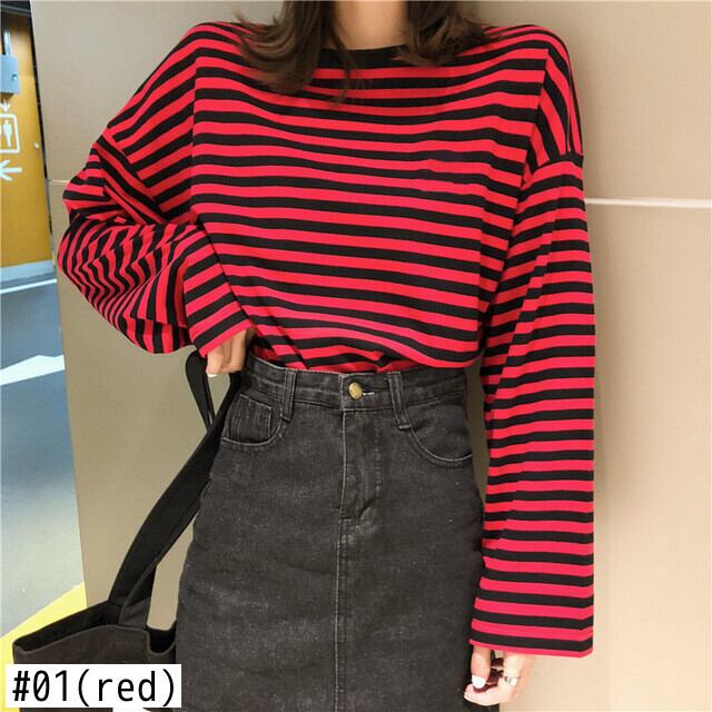 シンプルルーズレッドストライプ Tシャツ秋 O ネック長袖トップスすべて一致オフィスレディ秋 Tシャツ Ropa ロング オータム 秋物 Oネック 会社 学校 通勤や通学にも