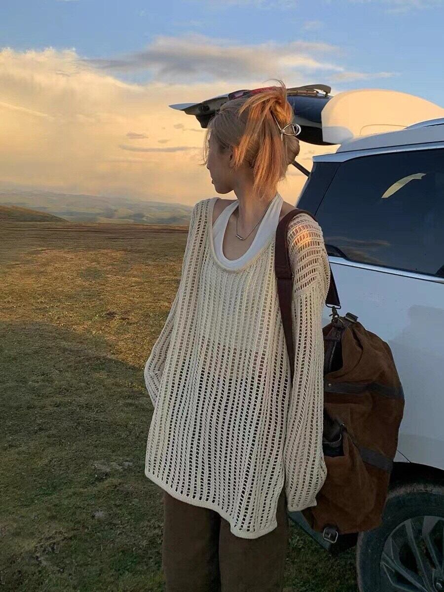 V ネックプル Y2k トップス中空アウトプルオーバー服セータールーズセーターニットセーター怠惰