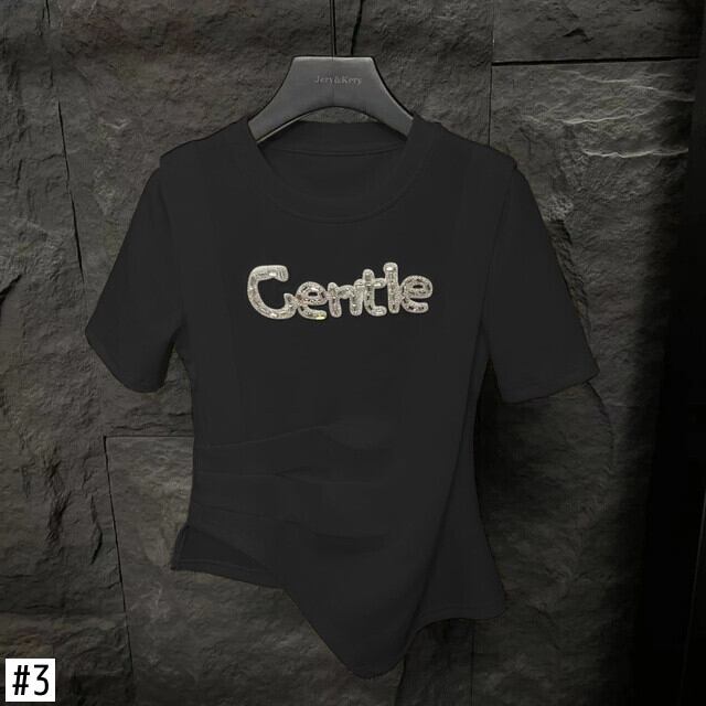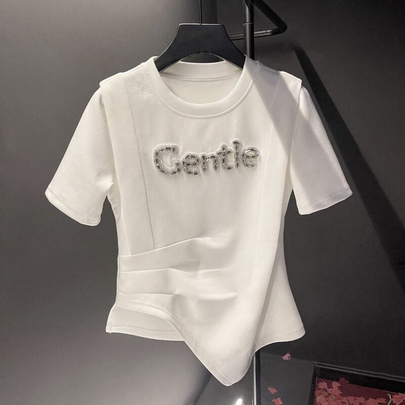 夏半袖コットン Tシャツラウンドネックビーズ文字ホワイト底シャツフリルベーシック段落トップスホワイト ショート ハーフスリーブ サマー 夏物 Oネック
