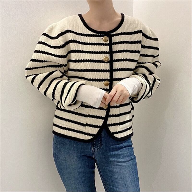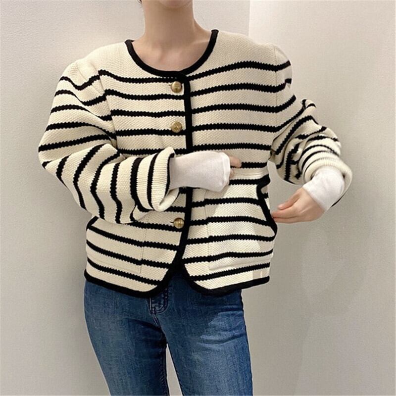 ラウンドネックルーズニットコートコントラストストライプセーターY2k服クロップドカーディガン Oネック