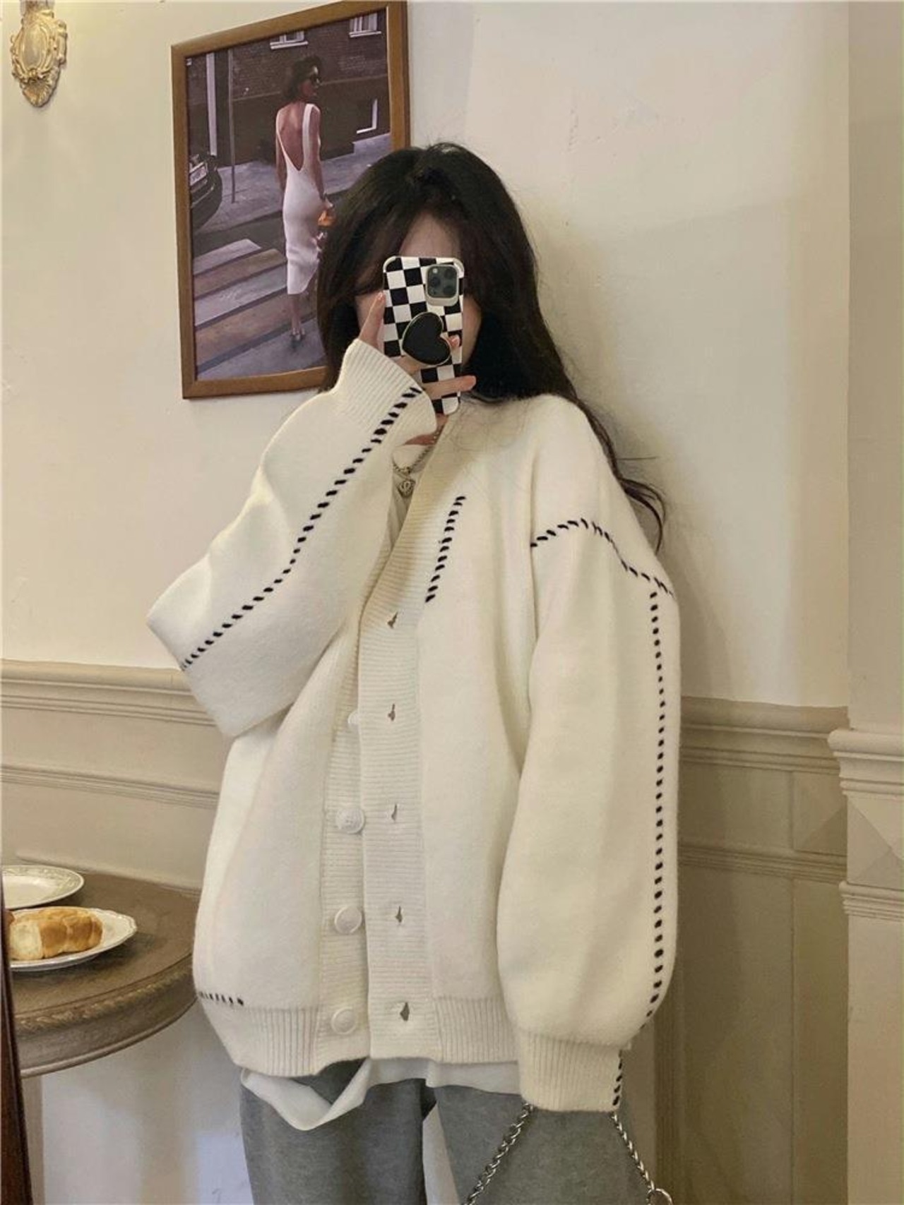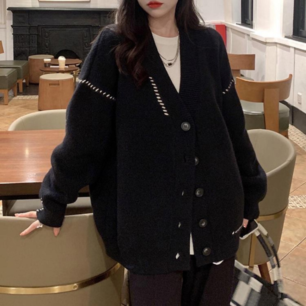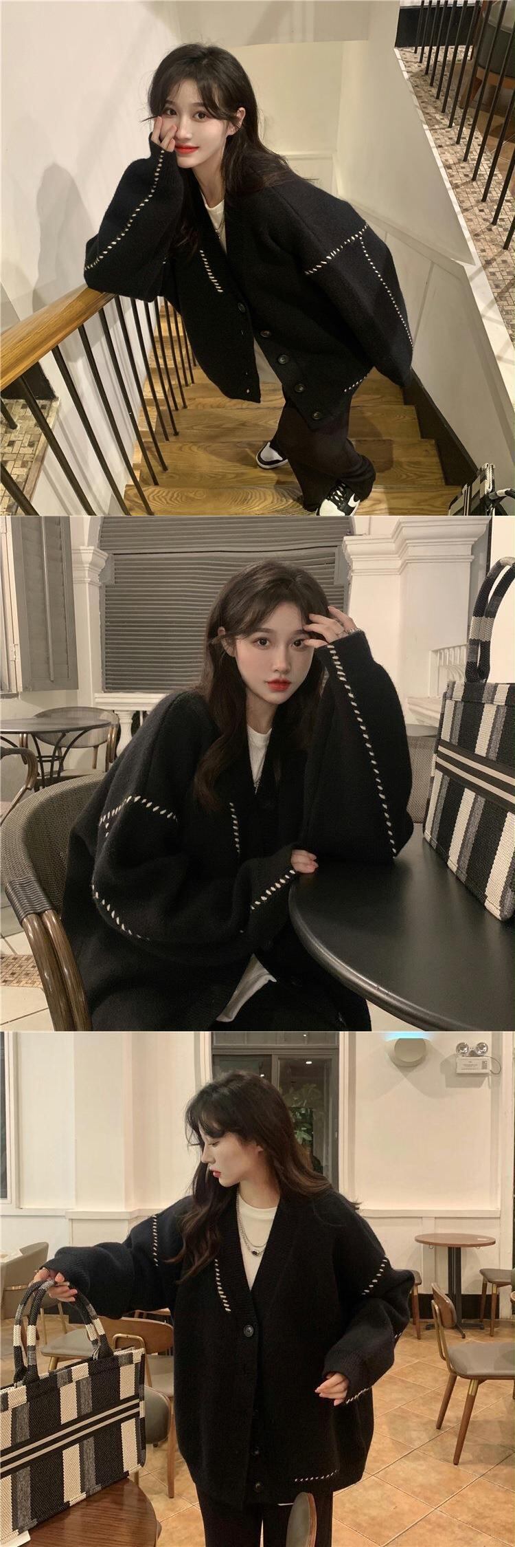 ルーズ生き抜く V ネック プレッピー スタイル Y2k 特大セーター秋冬セーター黒カーディガン ニット ジャケット プル ブラック オータム 秋物 ウィンター 冬物 Vネック