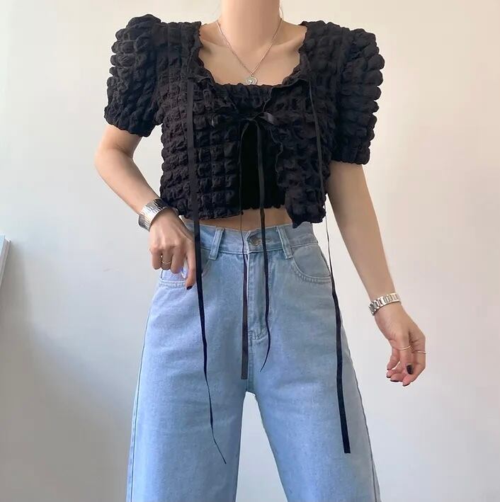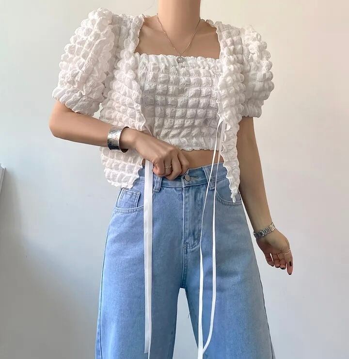 レースアップシャツデクロップトップブラウス3Dチェック柄シャツ白シャツ ホワイト