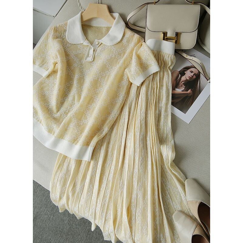 スカートセットニットトップ半袖Tシャツプリーツスカートクロップトップツーピースセットレディース衣装花柄チェック柄Tシャツ ショート ハーフスリーブ シルク