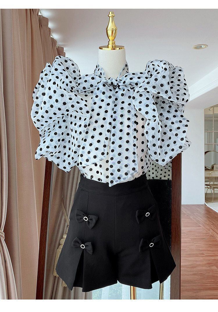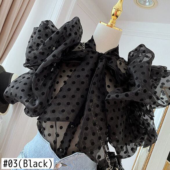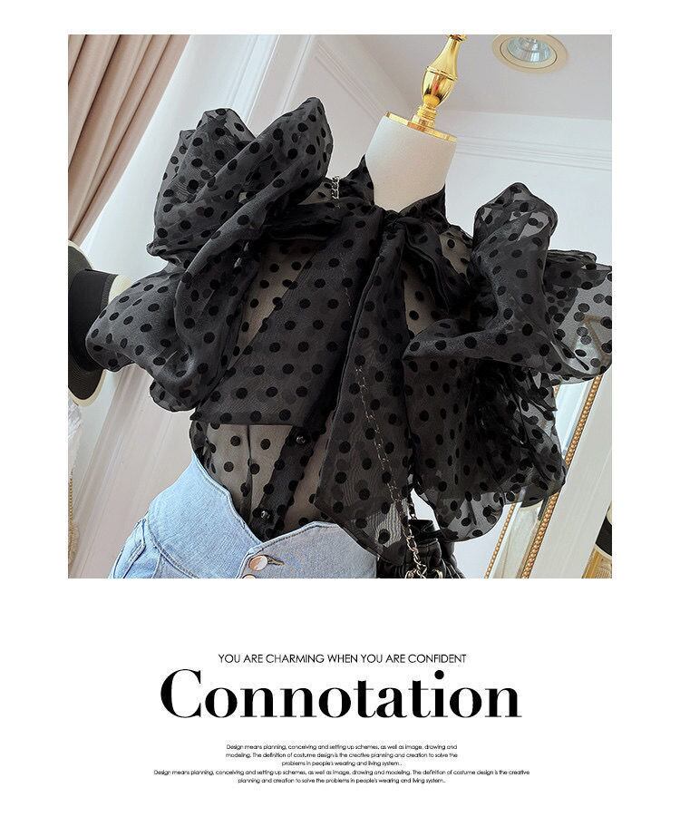 フリルパフスリーブ黒水玉シャツ Blusa 弓レースアップランタンスリーブ透明シャツブラウストップ ブラック リボン