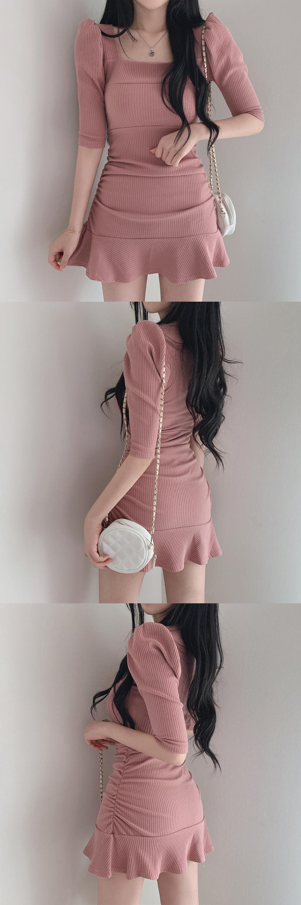 膝上 ピンク フィッシュテール ドレス スクエアカラー ヒップラップ 半袖 フリル プリーツ 甘い Vestidos デ ミニ ローブ トランペット ショート ハーフスリーブ 大人ガーリー スウィート キュート カジュアル スクウェア