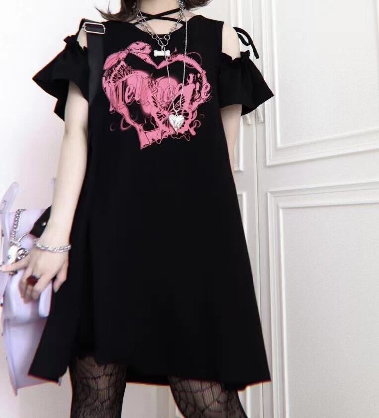 Vestido Feminino Y2k ドレスプリントルーズレースアップオフショルダー Tシャツ半袖ドレスブラックホワイトドレスローブ ショート ハーフスリーブ