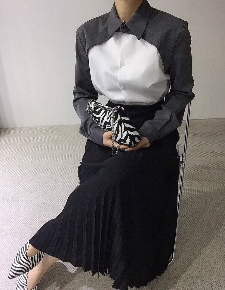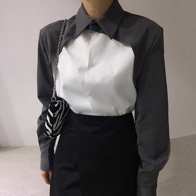 ラペルパッチワークルーズ多用途シングルブレスト長袖シャツデフェイクツートップブラウス ロング