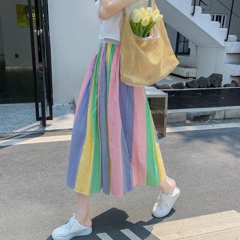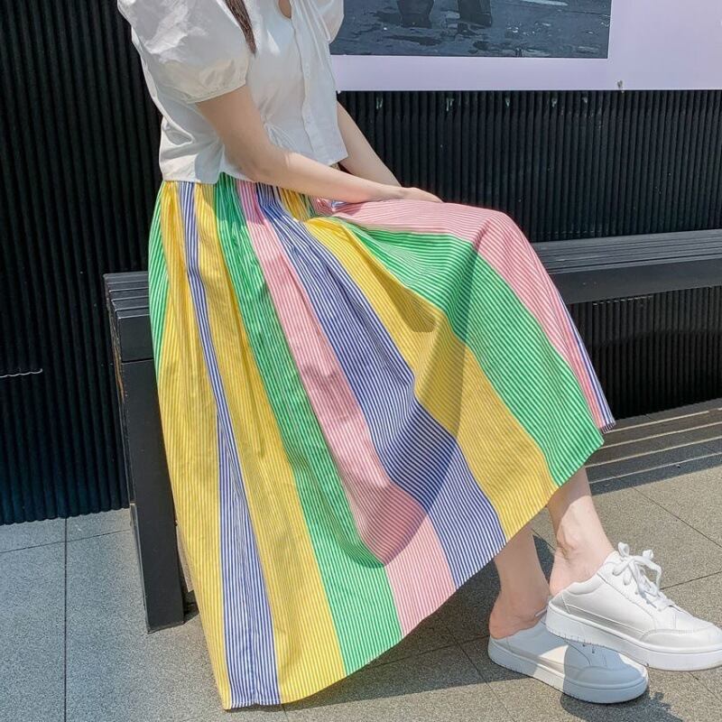 Aライン大きスイングアンブレラスカート甘いeseカラフルストライプスカートスタイルファルダスモーダY2kロングスカート 大人ガーリー スウィート キュート カジュアル
