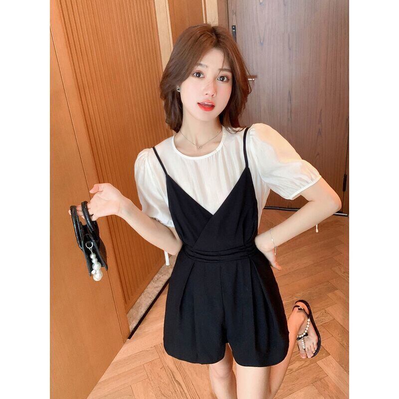 ショートセット ストラップ ジャンプスーツ ロンパース 黒 遊び着 ポケット オーバーオール 半袖 シフォン シャツ クロップトップ 2 点セット 衣装 ブラック ハーフスリーブ