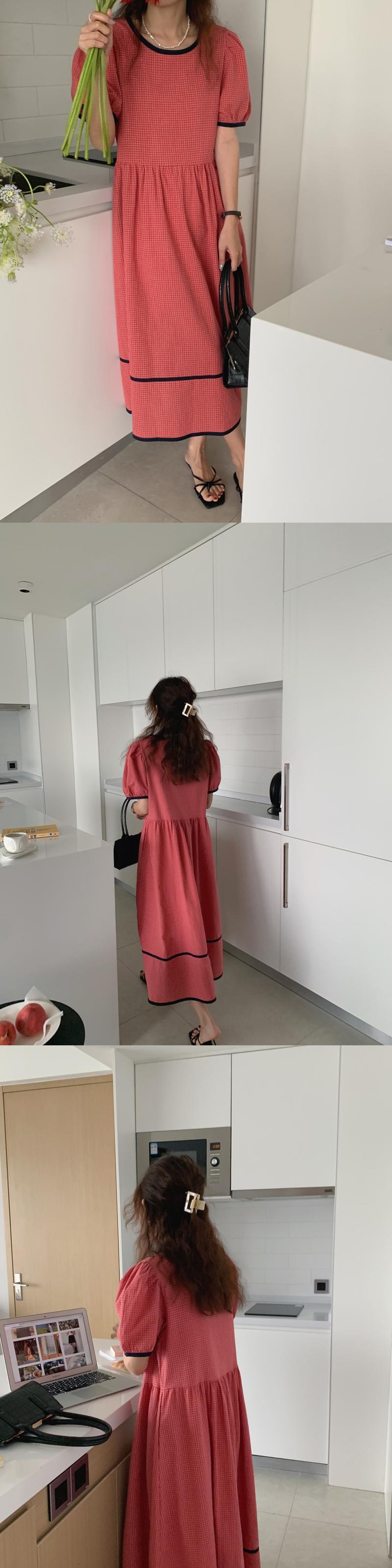 Vestidos ラウンドネックコントラストプリーツバブル半袖チェック柄ドレス夏ドレスマキシ ショート ハーフスリーブ サマー 夏物 Oネック