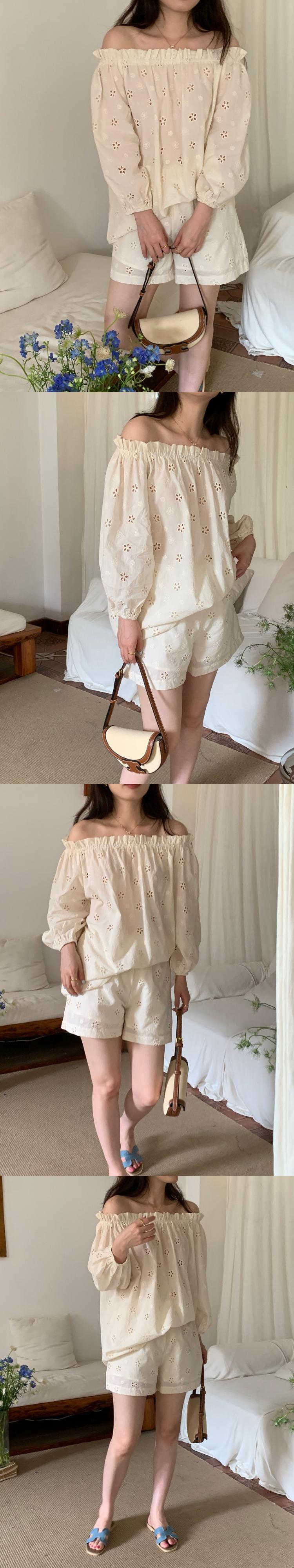 ショートセット中空かぎ針編み刺繍フラワーシャツオフショルダートップ弾性ウエストショーツスタイル 2 セット レッド エラスティック 伸縮 ブルマー フラワーデザイン 2セット