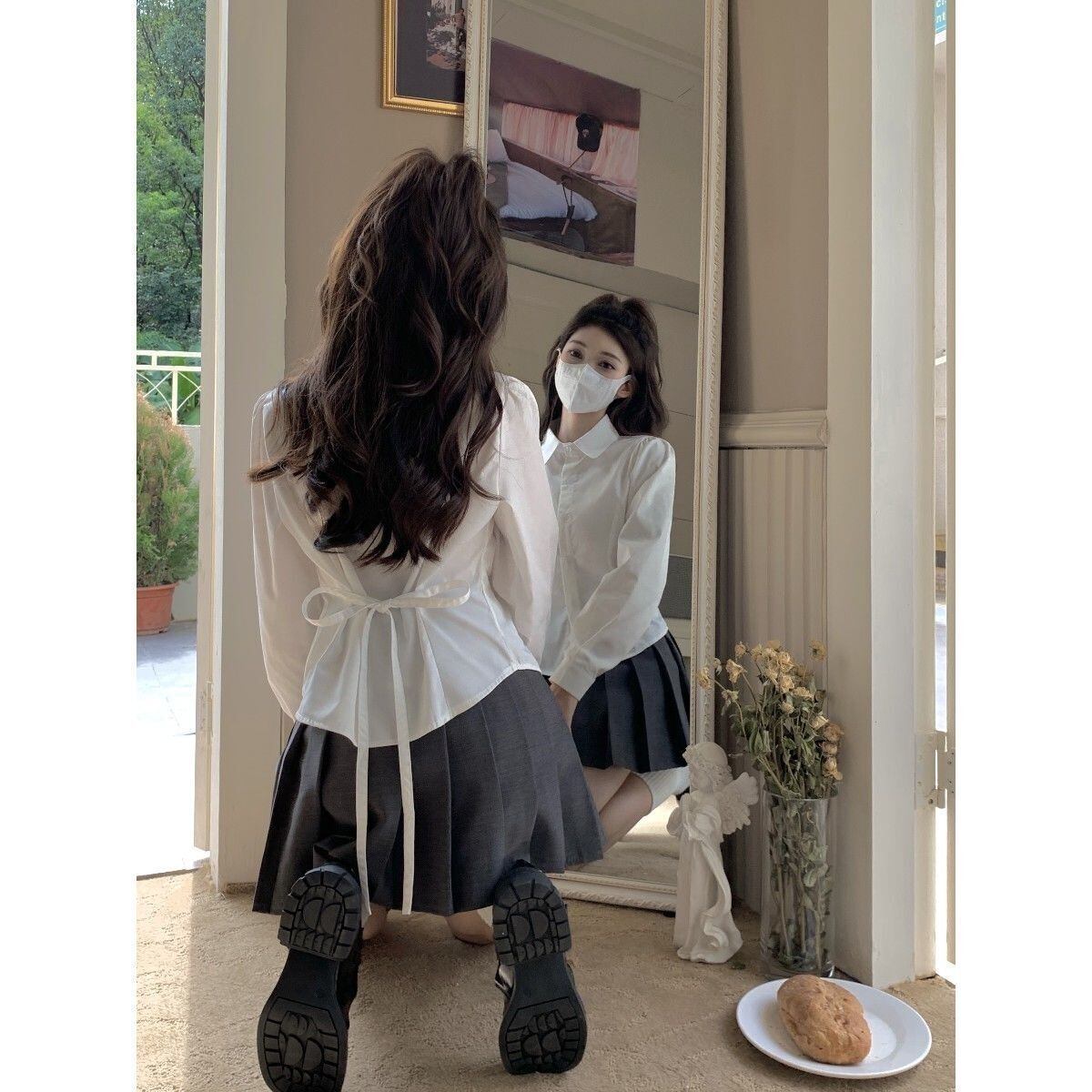 シャツ包帯甘い春スリムピュアカラーシンプルスタイル JK 学生トップスシック白インプレッピーソフト ホワイト 大人ガーリー スウィート キュート カジュアル スプリング 春物