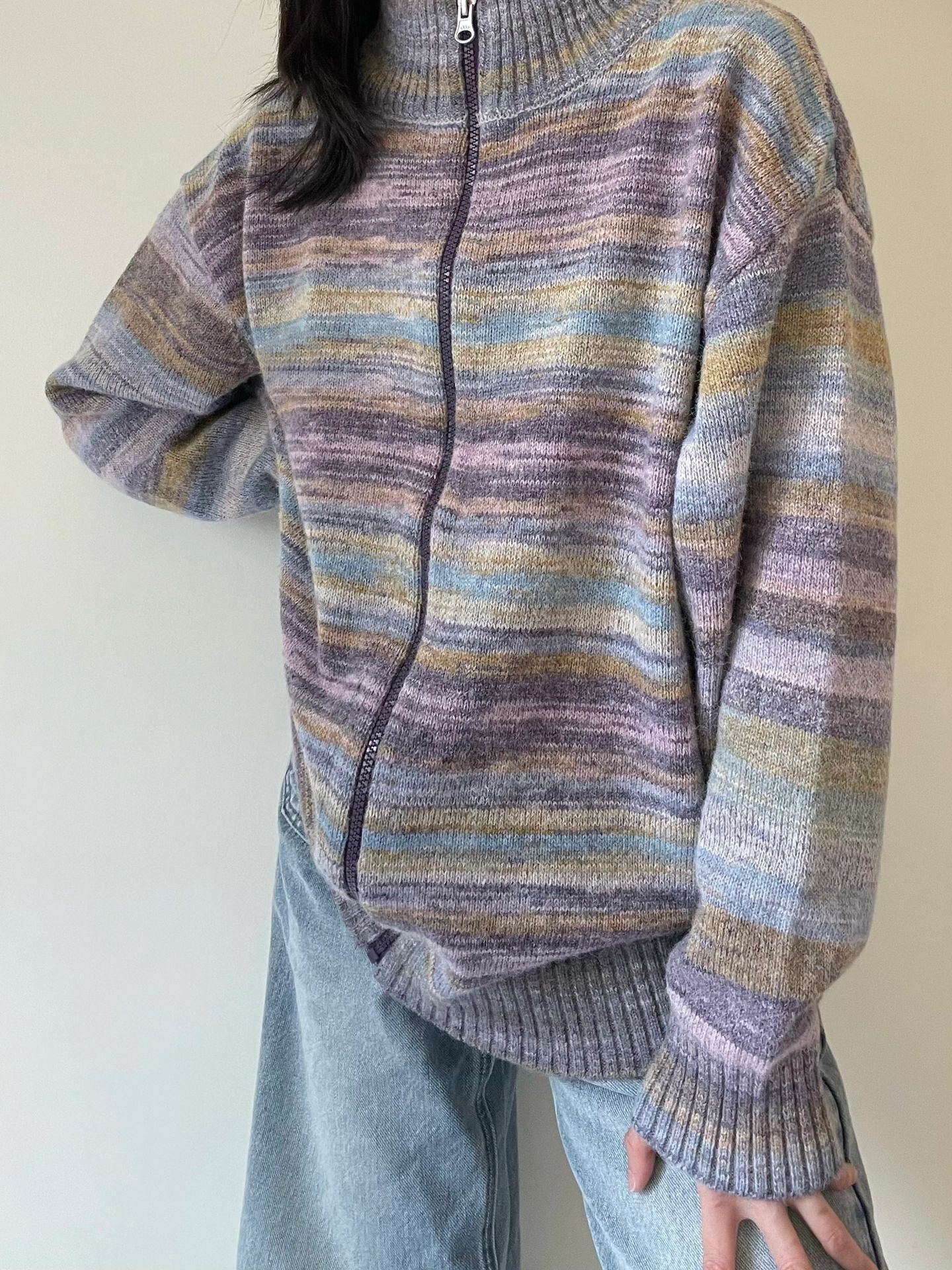 春秋スタンドアップカラー多用途レトロジッパーセーターストライプニットカーディガン Y2k コートレインボートップ スプリング 春物 オータム 秋物