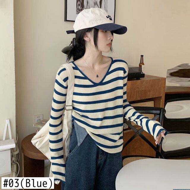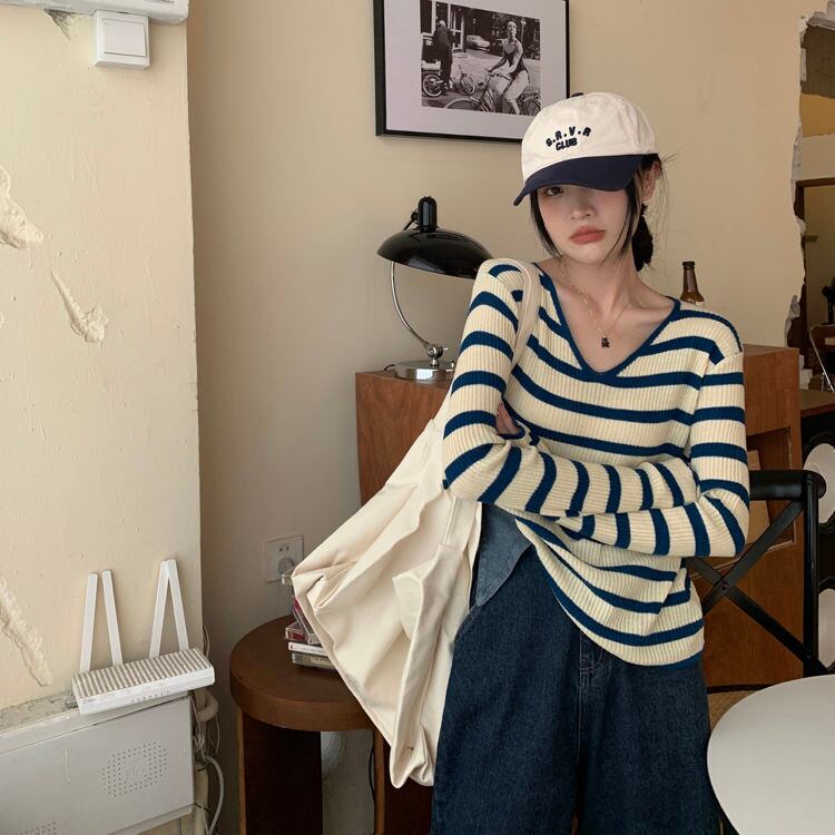 プルオーバー Y2k 服 V ネック長袖ブルーストライプセータージャンパースリムボトムトッププルニットシャツセーター ロング Vネック