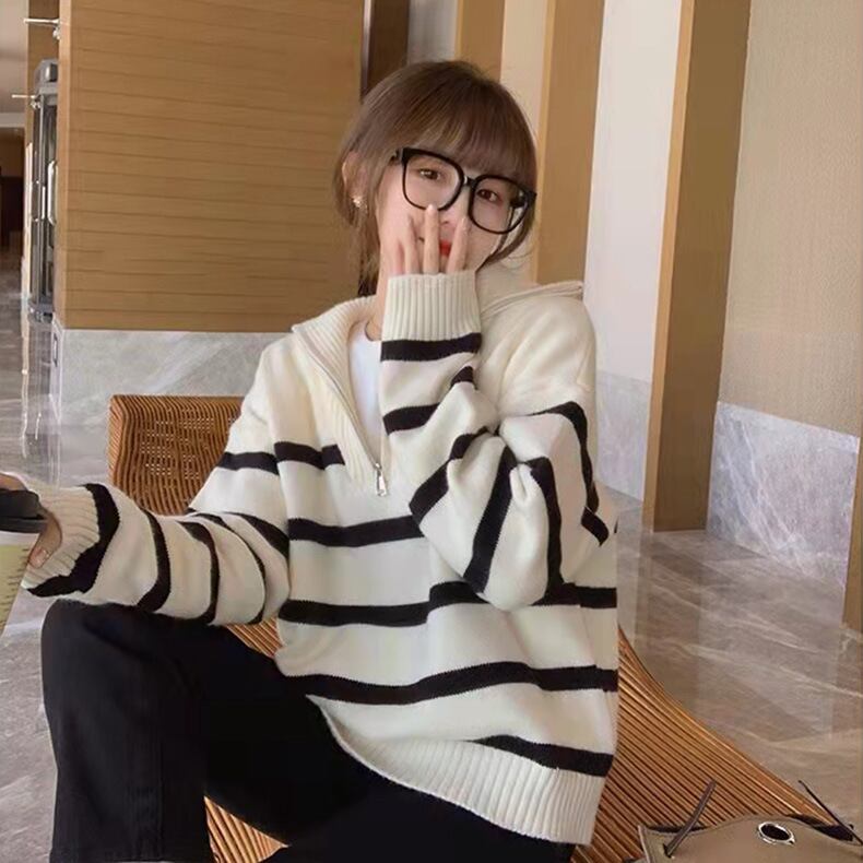 セーターコントラストブラックストライプセータータートルネックセーターレトロルーズジップ Y2k トップジャンパープルプルオーバー