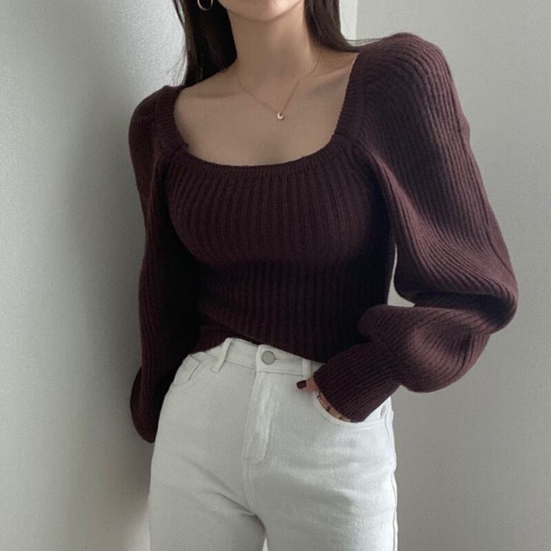 センスセーターズデプルプルオーバースクエアピンクニットセータートップススリムウエストクロップソリッドセーターTシャツ ソリッドカラー スクウェア