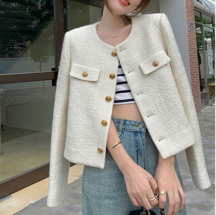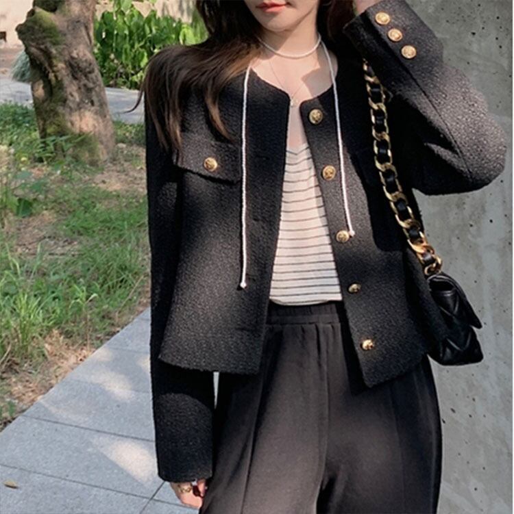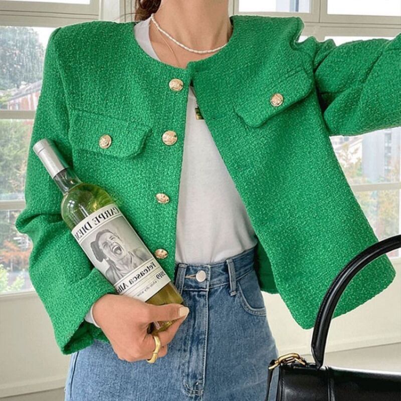 シングルブレストグリーンツイードウールジャケットシックボタン長袖ウールブレンドジャケットコート春秋トップ服 ロング スプリング 春物 オータム 秋物