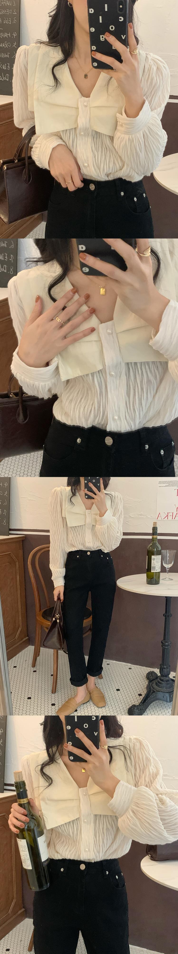 黒シャツ長袖春シック V ネック トップ ブラウスプリーツ シャツ ロング ブラック スプリング 春物 Vネック